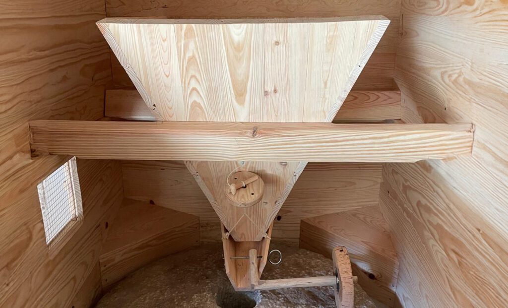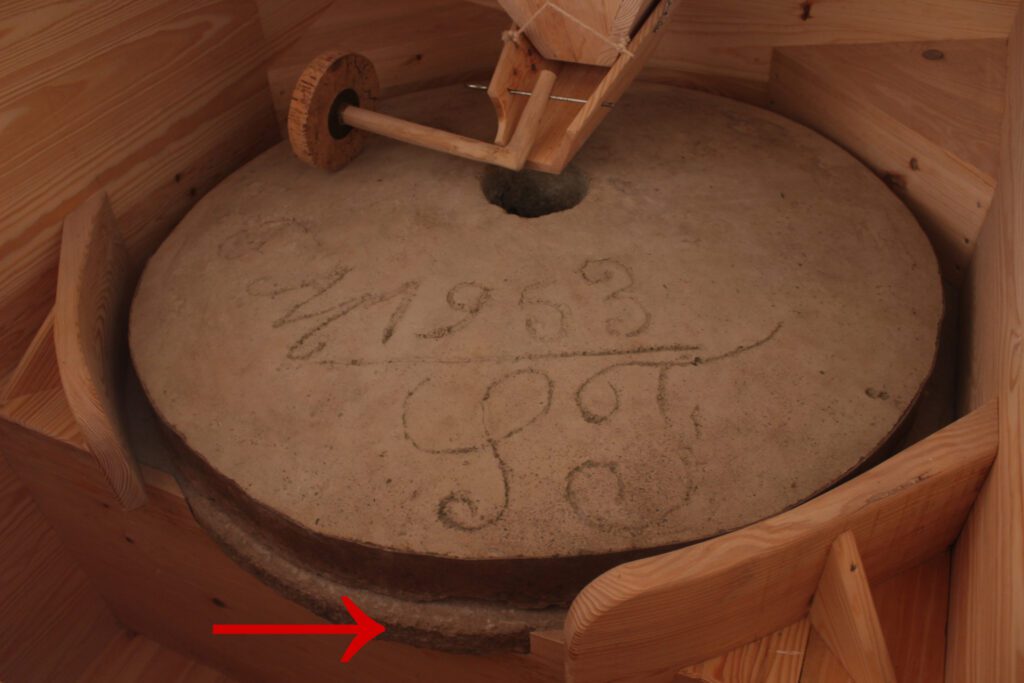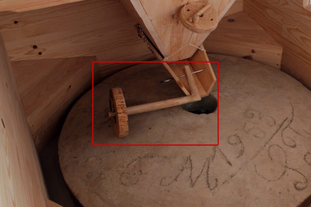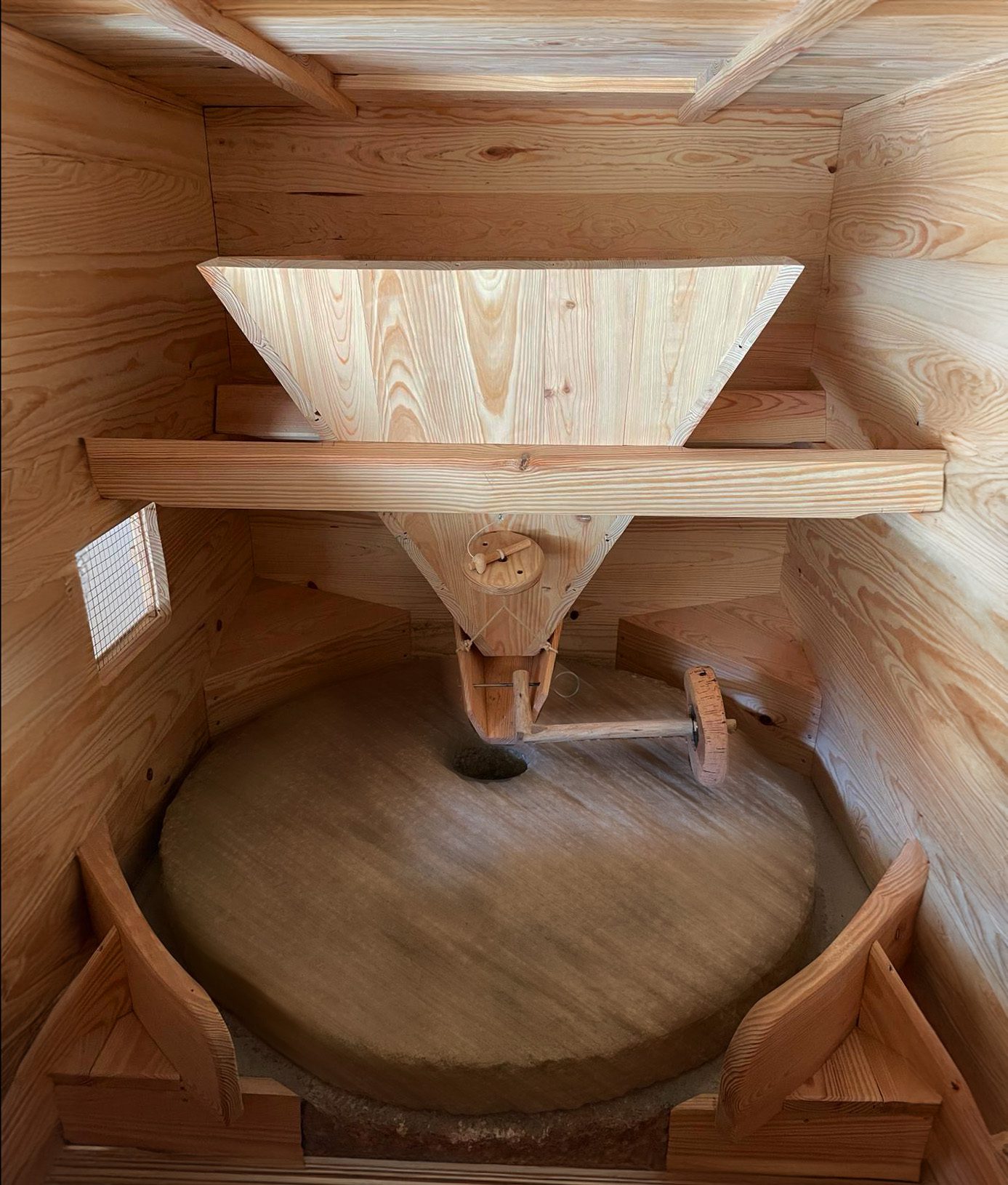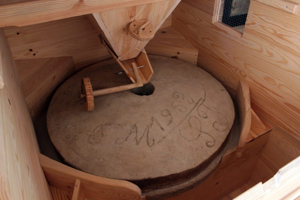Mó (pedra superior) do moinho, geralmente feita de granito, que esmaga o grão junto com a mó inferior, que é fixa, durante o processo de moagem. Fornece a força necessária para triturar os grãos.