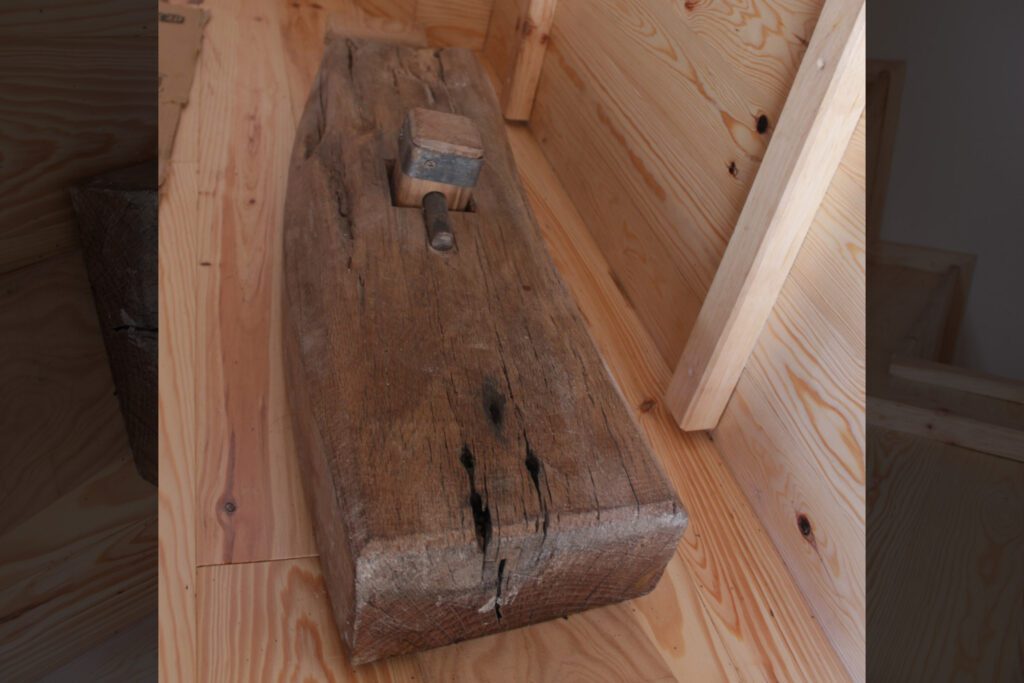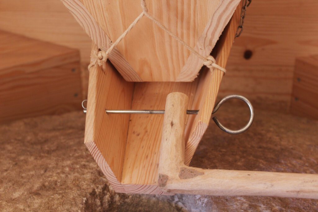 Adelha, caleira, quelho, canelha, caneleja, calha – Caleira alongada de madeira, por onde desliza o grão que vem da moega e vai para o olho da mó.